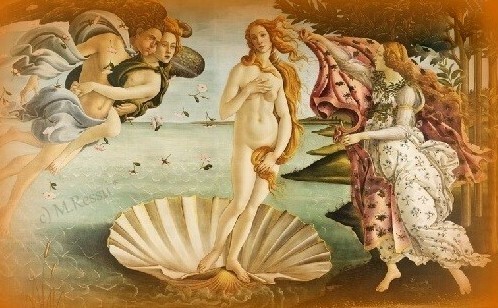 Esta pintura mostra a - Deusa Vénus - já adulta, mas dentro da Concha, que simboliza o seu nascimento, que diverge de significado, entre outros símbolos contextualizados.